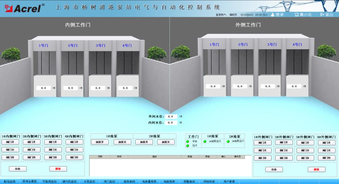 泵闸全景图可以帮助用户进行的监测泵闸的运行状态,比如内外河水位、节制闸东西方向的开度、内外侧闸门的开度、水泵运行的状态以及电流。
